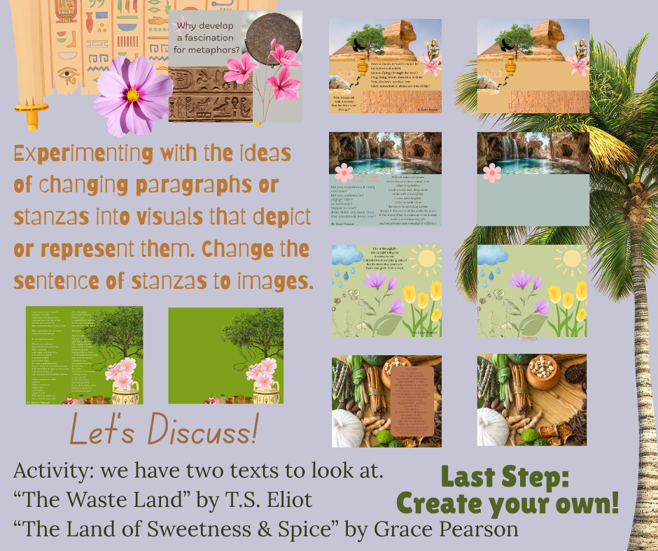 To learn about METAPHOR in English class. We will look at ancient metaphors, modern metaphors, and discuss their functions and purposes. A study of T.S. Eliot’s “The Waste Land” is perfect to introduce the American Modernist English movement that transformed English writing in the twentieth-century. Discussions about gifs vs. written and spoken languages. Discussions about contexts and why people would choose during periods of civilization to write in metaphorical code as well as what metaphorical purposes images had in ancient times and what it may mean about their interlanguage and ways of speaking language. Was it a code or a way of thinking and communication? Explore avenues of mysteries in the literary field, why should you become a literary archeologist? Finally, create your own!