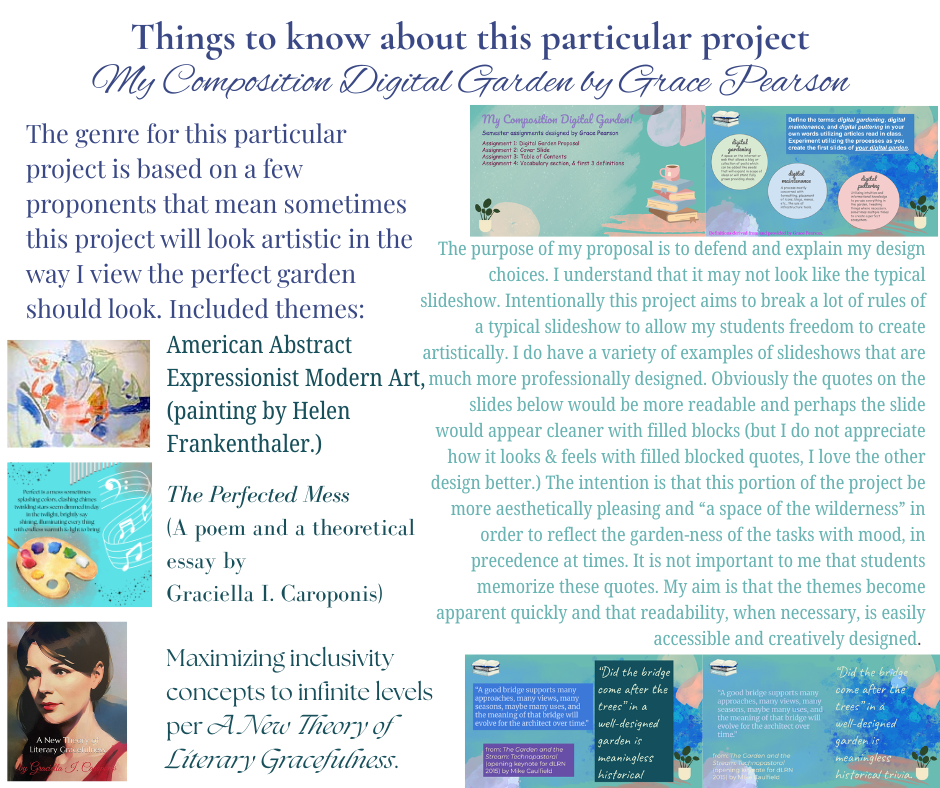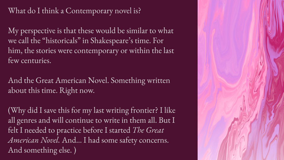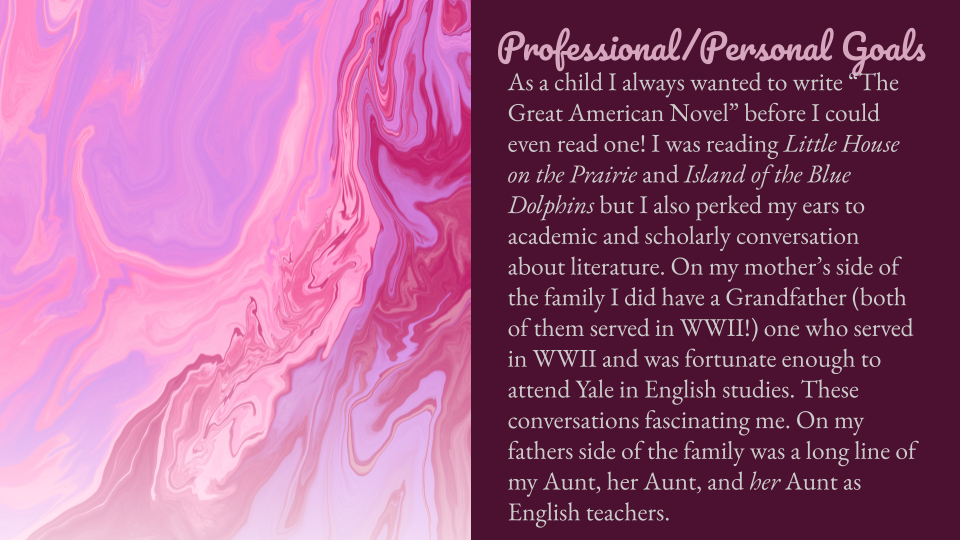 The project to “create a genre” is continuing and I enjoy it a lot. It was a necessity before I felt ready to write my own contemporary works. I feel that students may have a story they wish to tell and write and could feel that its genre is undefined or that it does not fit in any existing genre exactly. Or students may be interested in the process to see where it leads. I have done it now myself and it is not yet completed. (I always assign students a project I have done myself so that I can speak with from experience. As I have been completing this project, I did the steps all out of order. So, I will keep that in mind as I am teaching it. What I did first was define a reason why the genre is needed (& how it seems to be missing) through personal reflection and a similar genre that just wasn’t encompassing my modern needs and I named it. The second thing I did was define a bit more about what the genre would include: voice and audience. The third step is the personal and professional reasons I have posted below which was a reflection I was able/ready to make connections with after doing the first steps. Perhaps students can do the steps in any order and just place the chapters in the portfolio in a certain order. We will see. This sequence-lesson is still being designed.